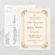 Elegante, Vintage Save the Date Postkarte mit Details in einem antiken Kupferrahmen mit Schnörkeln in den Ecken, über einem Elfenbeinhintergrund. Fügen Sie Ihre Rücksendeadresse und Ihre persönliche Nachricht auf die Rückseite. Dieses Design ist ideal für eine formelle Hochzeit.