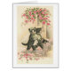 Eine Vintage Illustration der Braut- und Bräutigamkatzen an ihrem Hochzeitstag. Sie gehen auf Hinterbeine in ihrer Hochzeitskleidung, die Braut, die einen Blumenstrauß, entlang einem gestreuten Weg der Rose Blumenblatt trägt. Ein Bogen der rosa Rosen hängt über ihnen. Diese Karte ist leeres Innere für Ihre eigene Mitteilung.