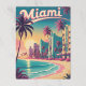 Ein lebendiges, Vintages Reiseplakat im Stil der 80er Jahre beherbergt einen farbenfrohen Sonnenuntergang über Miami Beach mit prominenten Palmen und Gebäude im Art-Déco-Stil direkt am Ufer.