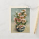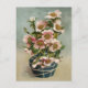 Vintage Postkarte mit rosa Blume in blauer Vase-Abbildung.