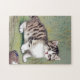 Puzzle mit einem gestreiften Kätzchen. Schwarze Streifen kreuzen über das Fell eines weißen Kätzchens. Eine weiße Blume schmückt einen Korb auf einem grasbewachsenen Feld. Ein fantastisches Geschenk für Katzenliebhaber und Viktorianische Kunstliebhaber!