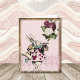 John Tenniels Darstellung des weißen Kaninchens in der Vintagen Alice im Wunderland im Geschichtenbuch-Märchen. Er trägt Herzkartonbekleidung, aquamarinen Kragen, eine Trompete blasen und eine Rolle mit grünem Edelstein halten. Burgund und weiße Rose mit Blumen ganz oben rechts. Rosa Hintergrundfarbe, Glitzer rosa Spitze unten, antike goldene Grenze.