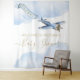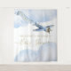 Vintage Babydusche mit blauem Vintagem Flugzeug mit einem Jungenbanner auf blauem wolkenfarbenem Hintergrund. Die Babydusche des Flugzeugs lässt sich leicht an Ihren Text anpassen.