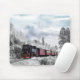 Mousepad mit Foto einer schneebedeckten Winterlandschaft mit schneebedeckten Kiefern. Ein roter, goldener und schwarzer altmodischer Zug, der durch die Wildnis fährt. Verspricht Gedanken, zu Weihnachten Zuhause zu kommen.