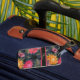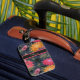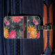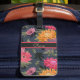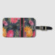 Helle Vintage Gepäckmarke mit rosa, orangefarbenen und violetten Blumen auf dunkelblau grauem Hintergrund. Stipe Detail stellt Kontrast bereit, Fügen Sie Ihren eigenen benutzerdefinierten Text, Namen oder Initialen hinzu.