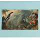 Vintage Malerei einer botanischen Szene mit herumfliegenden Papageien und Schmetterlingen. Palmen an den Seiten mit einem Berg im Hintergrund. Tropische Blume auf der Vorderseite
