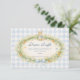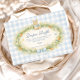 A charming vintage baby shower design featuring a sweet watercolor bunny resting above a delicate spring garden wreath. Soft daisies, greenery, and tiny carrots form a whimsical botanical frame, finished with a gentle ribbon bow and a soft blue gingham background. The storybook illustration style and pastel countryside palette create a timeless cottagecore aesthetic that feels warm, playful, and perfect for celebrating a new little arrival.