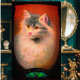 Ein wunderschönes grauweißes, langhaariges Haustierkatzen-Portraitbild, das in einem Jugendstil-Rahmen gerahmt ist. Eine elegante und niedliche Viktorianische Katze.