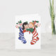 Vintages Bild Weihnachtsbild mit zwei Kindern, die in Weihnachtsfeiertagen mit heiligen Blätter und Beeren dekoriert sind. Der Junge ist im rot-weiß gestreiften Strumpf und das Mädchen ist im blau-weiß gestreiften Strumpf.