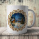 Artistic depiction of a peaceful winter village surrounded by snow and framed with an ornate lace doily. This elegant Christmas-themed mug evokes the charm of traditional holidays and makes a lovely seasonal gift.