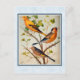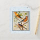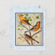 Postkarte mit digital gereinigtem und verbessertem Vintage-Bild eines Greenfinch, Bullfinch und Linnet. Farbige Darstellung der Naturgeschichte von W. Rutledge aus dem Illustrierten Kanarischen und anderen Käfigvögeln, 1878. Gerahmt und mit einer hellblauen Pergamentstruktur unterlegt.