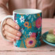 Feiern Sie die magische und festliche Urlaubssaison mit unseren maßgeschneiderten Tasse. Unser elegantes Urlaubsdesign zeichnet sich durch ein Vintages, von Hand gezeichnetes Weihnachtsmuster aus. Fein rosa, blau und pfirsichfarben mit Imitaten goldenen Akzenten, Blätter und Rentieren. Ein aquamariner Hintergrund kontrastiert wunderschön mit den lebhaften Blumen. Stilvolle Rentiere und Schneeflocken werden perfekt in die Vintage Blüte vermischt, um ein modernes, elegantes Weihnachtsmuster zu schaffen. Alle Illustrationen in dieser eleganten, Vintagen, blumengeschmückten Tasse sind handgezeichnet Originalkunstwerke der Moodthologie.