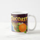 Vintage Illustration Fruchtkiste mit einer großen, reifen, Bio Orange mit Blume und einer Karte der Südküste des Staat von Kalifornien mit dem blauen Pazifik. Retro Werbung für Pacoast-Orangen, frische Zitrusfrüchte aus dem Bauernhof. Gesunde Ernährung mit Vitamin C.