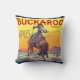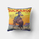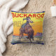 Vintage Illustration Obstkiste Kunstwerbung mit einem Cowboy, der in der Wüste ein buckliges Broncopferd reitet. Der goldene Hintergrundhimmel könnte entweder ein Sonnenaufgang oder ein Sonnenuntergang über der Prärienlandschaft sein. Eine Retro-Werbung für Äpfel der Marke Buckaroo.