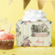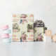 Vintages Weihnachtspersonalisiertes Geschenk-Verpackungspapier, durch die red_dress, das Wort "frohe Weihnachten" (roter Skript-Schriftart) und ein nahtloses Muster mit Vintagen Illustrationen des rosa Kastens Stechpalmenbeeren (WeihnachtsBlumen), mit den Wörtern "kennzeichnend ein helles Weihnachten" und Vintages Kind, das einen Hut trägt (Papierhut?), rosa füßige Pyjamas (alle in einem sleepsuit), beim Spielen ein Horn und Tragen einer roten Trommel und blauen des WeihnachtsStrumpfs, mit Spielwaren (brauner Teddybär oder -ball).