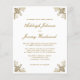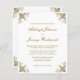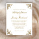 Diese elegante Vintag-inspirierte formelle Hochzeitseinladung enthält den Text in goldfarbenem Drehbuch und Serif-Schriftart, gerahmt von verzierten dekorativen Goldmotiven in allen vier Ecken. Die Eckmotive werden auf der Rückseite wiederholt. HINWEIS: Umschläge sind nicht automatisch in diese Einladungen mit dem Budget eingeschlossen. Bitte denken Sie daran, die Option "weiße Umschläge" zu wählen!