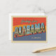 Dieses Design ist eine klassische Postkarte im Vintagen Stil mit dem Satz "Grüße aus Alabama" in großen, stilisierten Buchstaben. Jeder Buchstabe von ALABAMA enthält eine einzigartige Szene oder Sehenswürdigkeit aus dem Staat, einschließlich der Staat-Hauptstadt, historischen Gebäude und natürlichen Landschaften. Das ästhetische Ganze hat mit seiner Retro-Farbpalette und seinem kühlen Schriftart ein nostalgisches Ambiente, das sich perfekt für Produkte wie Postkarten, Plakate und T - Shirt eignet, die für alle Lieben der uralten Reisekunst oder des Alabamas Erbes geeignet sind.