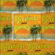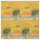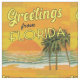 Grüße aus Florida im Stil der Vintagen Grüße Postkarten mit einer Illustration eines Sonnenuntergangs über dem Strand mit Palmen. Lebhafte Retrofarben und Schriftart bringen uns zurück in die Altstadt von Florida. Vergnügen Sie sich bei der Dekoration des Strandhauses!
