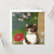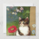 Karte mit einer niedlichen Kätzchen-Abbildung. Eine weiße Katze mit dunkelbraunen Streifen entspannt sich in einem Garten mit Frühlingsblumen. Ein perfektes Geschenk für Katzenliebhaber!