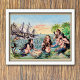 Diese lustige Retro-Abbildung zeigt eine Gruppe von Meerjungfrauen, die mit einem Schiff und Palmen im Hintergrund im Ozean baden. Reiche Vintage Farben und wunderbare Gesichtsausdrücke!