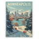 Dieses Notizbuch im Minneapolis-Stil zeigt eine Vintage Winterlandschaft mit Blick auf die Skyline der Stadt und eine Brücke über den eingefrorenen Fluss. Das Design vereint den kühlen Charme und die urbane Landschaft von Minneapolis im Schnee. Dieses Spiralnotebook ist ein perfektes Geschenk für Reisende, Winterfreunde oder alle, die die einzigartige Retro-Attraktion der Twin Cities schätzen.