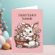 Niedlich Osterhase mit einem Korb voller Schokolade. Vergnügungs-Farbseite auf der Rückseite! Große, personalisierte Osterkarte für Kinder.