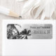 Vintages Schwarz-Weiß-Foto eines tropischen Strandes mit Palmen, der sich über das Meer erstreckt.