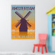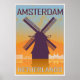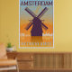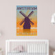 Amsterdam vintage poster in orange and blue textured background with skyiline in white