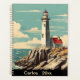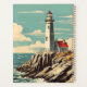 Ein Leuchtturm und die Hütte des Wärters liegen auf einem Felsvorsprung, an einem blauen Himmelstag über einem ruhigen Meer, der in einem Vintage-Poster-Stil gehalten ist.