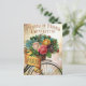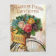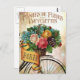 Eine hübsche, blumengeschmückte Postkarte, die ein französisches Design eines Korbs von Blume auf einem Fahrrad zeigt.