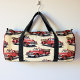 This duffle bag features a charming pattern of classic red pickup trucks, many equipped with ladders, against a subtle tan background. The vintage design includes various angles of the trucks, creating a nostalgic and appealing visual. A prominent red side pocket with a fire department emblem is personalized with "FIRE RESCUE," "JENNY SAMSMITH," and "Vancouver B.C.," making it a unique and functional accessory Personalize with your name and department home town and more. monogram