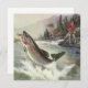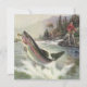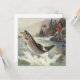 Vintages Illustrationsportdesign mit einem Fischer in einem Fluss. Eine Regenbogenforelle spritzt und springt aus dem Wasser.