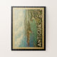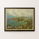 Antigua-Entwurf in der Vintagen Reiseart, die eine tropische Inselszene mit Ozean und blauem Himmel kennzeichnet.