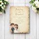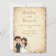 Dieses elegante Comic im Buchstil lädt zu einer modernen Hochzeit ein. Das Retro-Design zeichnet sich durch eine Vintage Braut- und Bräutigam-Illustration und schwarze Kalligraphie auf einem Comic-Buchhintergrund aus.