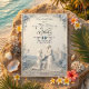 Announce your timeless love story with an elegant, traditional aesthetic featuring a beautiful dusty blue and cream palette for your formal celebration.This design showcases a classical romantic aesthetic centered on a beautifully illustrated proposing couple motif. The visual hierarchy draws the eye from the delicate floral corner borders—composed of roses, daisies, and botanical leaves—down to a man kneeling with a ring before a woman in an elegant gown. The backdrop depicts a classical chapel and cobblestone path set against rolling hills, all rendered in a cream and off-white base with dusty blue accents. The layout balances formal navy blue calligraphy script with clean modern sans-serif numbers and classic serif lettering.This is a flat printed image with a faux 3D bas-relief style and embossed effect, not actual raised material.