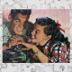 Vintage Illustrations-Liebe und Romantik-Bild mit jungen, glücklichen Teenagern, die ihre anhaltende Liebe versprechen, mit einem viel versprechenden Klang beim Musikhören ihres Plattenspielers. Niedliche und romantische Verlobung. Der Junge steckt sich einen Ring mit Diamanten-Verlobung auf den Finger.