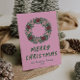 Wenn Sie eine einzigartige und schöne leicht bearbeitbare Weihnachtskarte suchen. Dieser ist perfekt für dich. Und wie Sie sehen, zeigt das Design einen handgefertigten und gezeichnet grünen Bandschleifer Kranz. Mit einer grünen Hand geschrieben Kalligraphie von MERRY CHRISTMAS. Und ein Grußteil in der Rückseite in einem heiligen Blätter und roten Beeren Rahmen. Alles Auf fett und hell rosa Hintergrund.