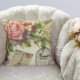 Ein hübsches, feminines Vintages Design für dieses Kissen, mit rosa Rosen, Lilie des Tales, einem Songbird im Käfig, einer Postkarte aus Paris und antiken Schriften, um Ihrem Zuhause oder Geschenk geben einen Dekorator, Shabby Chic Stil.