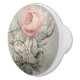 "Vintages Blumengemälde Französisch Rosengraue Ephemera Keramik Knob" hübsches botanisches Kunstwerk englischer antiker Rose in Rosa und einem blassgrünen, grauen Grün und einer postage Annullierung Briefmarke ephemera über ein bedrücktes, gealtertes Damastgrau auf grauem Damast für einen femininen mädchenartigen mädchenartigen Stil. Grafisch entworfen von Audrey Jeanne Roberts, international lizenzierter Künstlerin und Designer, Copyright.