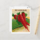 Postkarte mit einer wunderbar grafischen, roten, rassigen Samenpackung Anfang des 19. Jahrhunderts. Ein Paket von sechs oder mehr, allein oder mit anderen Designs gemischt, wäre ein großartiges Geschenk für einen Koch oder Gärtner.