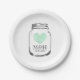 Vintage Papier Party Teller mit Hochzeitsmonogramm plus Heiratsdatum. Anpassbare Farbe und personalisieren den Namen Anfangsbuchstaben von Braut und Bräutigam. Elegante Typografie im rustikalen, schicken Maurerglas-Design. Niedliches romantisches Design mit Vintagem, grünem Herzenssymbol. Symbol für verblichene Liebe Teller für Hochzeit, Brautparty, Verlobung, Grillen, Jubiläum oder Junggeselinnen-Abschied. Anpassbare Hintergrundfarbe. Ideal für Hochzeiten im Freien im Sommer um Juli, August, September.