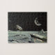 Vintage Illustration Weltraum und Planeten futuristische Science Fiction Bild. Reise- und Transportdesign mit Rocketschiffen, die auf dem Mond starten und in Zukunft im Dunkeln Nachthimmel auf den Planeten Erde fliegen.