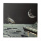 Vintage Illustration Weltraum und Planeten futuristische Science Fiction Bild. Reise- und Transportdesign mit Rocketschiffen, die auf dem Mond starten und in Zukunft im Dunkeln Nachthimmel auf den Planeten Erde fliegen.