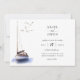 Vintages Wassersportboot, Hochzeitsreise zum Thema Wassersport. Koordination von dunkelblauem Untergrund, Segel und Wasserakzent. Die Einladung beinhaltet eine schicke Typografie Design Stil Mischung aus Kalligrafie und fett-Typ.