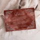 Diese elegante, Vintag inspiriert Hochzeitszittel-Kapselkarte zeigt den Text in einem hellsilbergrauen Drehbuch und Serif-Schriftart, gerahmt durch ein zartes Vintages silbernes Blattmotiv in vier Ecken auf einem cinnamonrostbraunen Aquarellhintergrund. Der Rahmen und der Aquarellhintergrund werden auf der Rückseite wiederholt.
