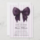 Celebrate the impending arrival of your little one with this chic baby shower invitation. The design features a soft lavender and white vertical stripe pattern, exuding a sense of calm and sophistication. A striking deep purple bow graphic adds a touch of elegance and visual interest to the front. On the reverse, a designated 'Scan Here' area is ready for your QR code, making it effortless for guests to RSVP or find more event details. This invitation is a perfect blend of classic design and modern convenience.