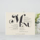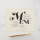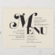 Diese Vintagen Stil 11" x 8,5" Hochzeitsessen Papier Blatt Menüs schwarze Schrift mit einem stilisierten "Menü", in großen schwarzen Buchstaben auf einem cremefarbenen Hintergrund. Auf der Speisekarte stehen Platzhalter für 2 Vorspeisen, 2 Vorspeisen, 2 Nachspeisen und 2 Desserts sowie die Initialen der Hochzeit.