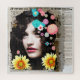 Hübsche, altmodische Vintage Frau, umgeben von Zeitungstexten und hübschen rosa und roten Blume Papier Collage Effekt Kunst.