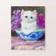 Puzzle mit einem süßen weißen Kätzchen! Diese flauschige Katzenkätzin Posen in einer blauen Schüssel mit rosa Blume dekoriert. Ein wunderbares Geschenk für Katzenliebhaber und Viktorianische Kunstliebhaber!