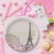 Vintager Eiffelturm Collage mit rosa Wildblumen Pappteller